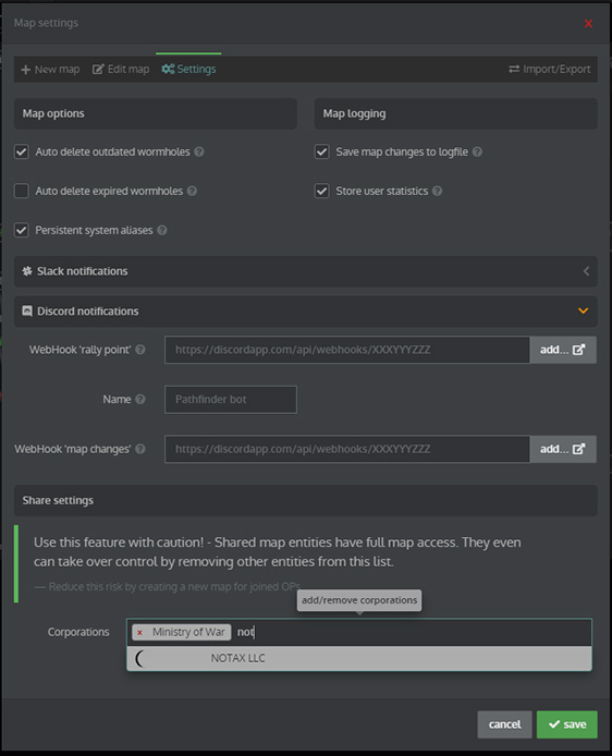 The following map types are available. Each map you create can be converted into any of these types at any time. The access level of a map depends on their type. e.g. "Corporation" maps can be seen/edited by any pilot in your corporation.